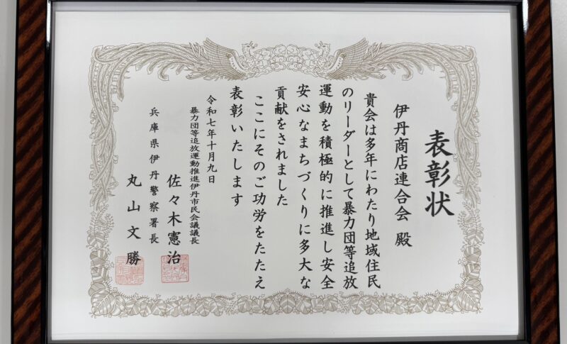 2025.10.14 伊丹商店連合会が「まちづくり功労団体」として表彰されました Uncategorized Post Share Hatena Pocket RSS feedly Pin it 令和7年10月9日、伊丹アイフォニックホールにて開催されました「令和7年度 暴力団・暴走族・薬物乱用追放 安全安心まちづくり伊丹市民大会」において、伊丹商店連合会は まちづくり功労団体 として表彰を受けました。 Post Share Hatena Pocket RSS feedly Pin it 伊丹商店連合会70周年記念式典開催 前の記事